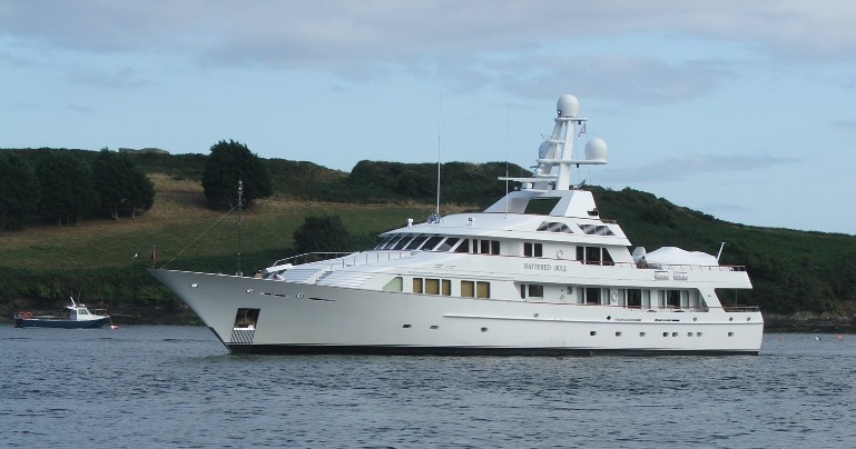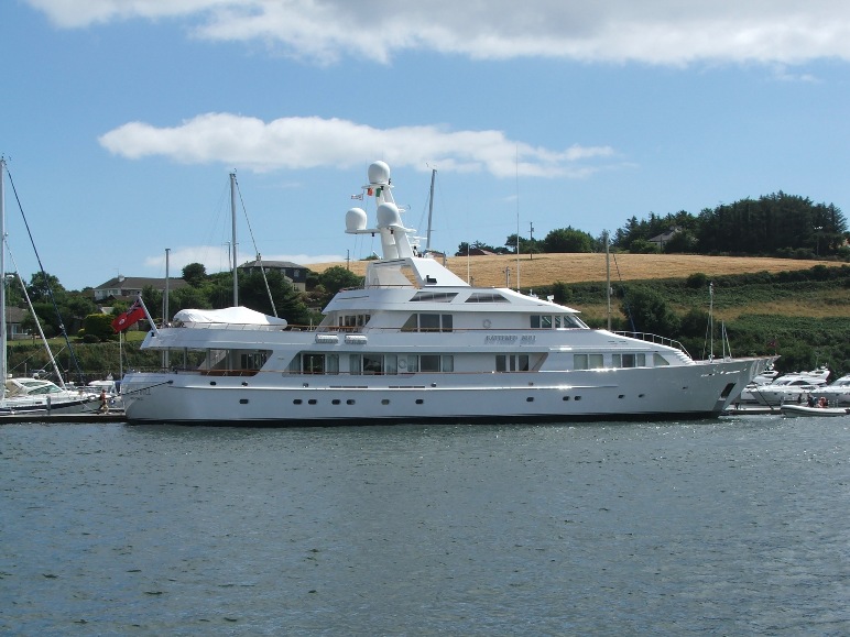 Kinsale - Super Yacht Battered Bull from Florida complete with full crew in uniform to take the grandchildren ashore to see the native culture. Massive garage transom ramp for all the gizmos including 2 launches, speed boat, assorted ribs, etc, all totally hidden. The owners are serious dive enthusiasts and she is one of the few super yachts to have her own decompression chamber.
